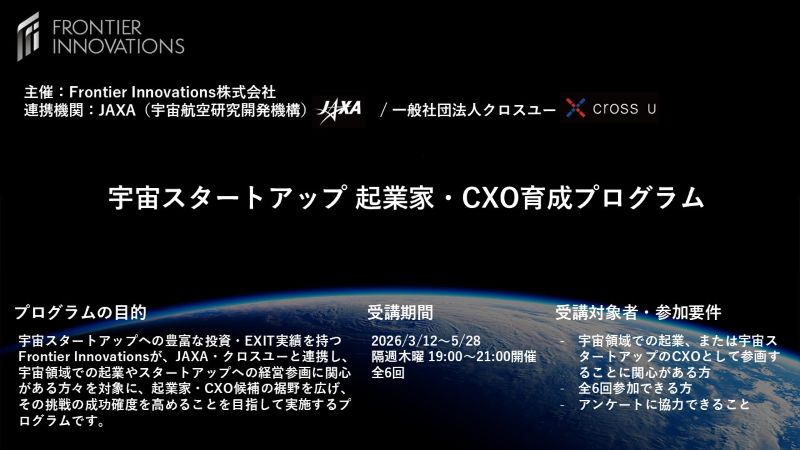 NEW宇宙スタートアップ 起業家・CXO育成プログラム(主催:Frontier Innovations、連携機関:JAXA・クロスユー)