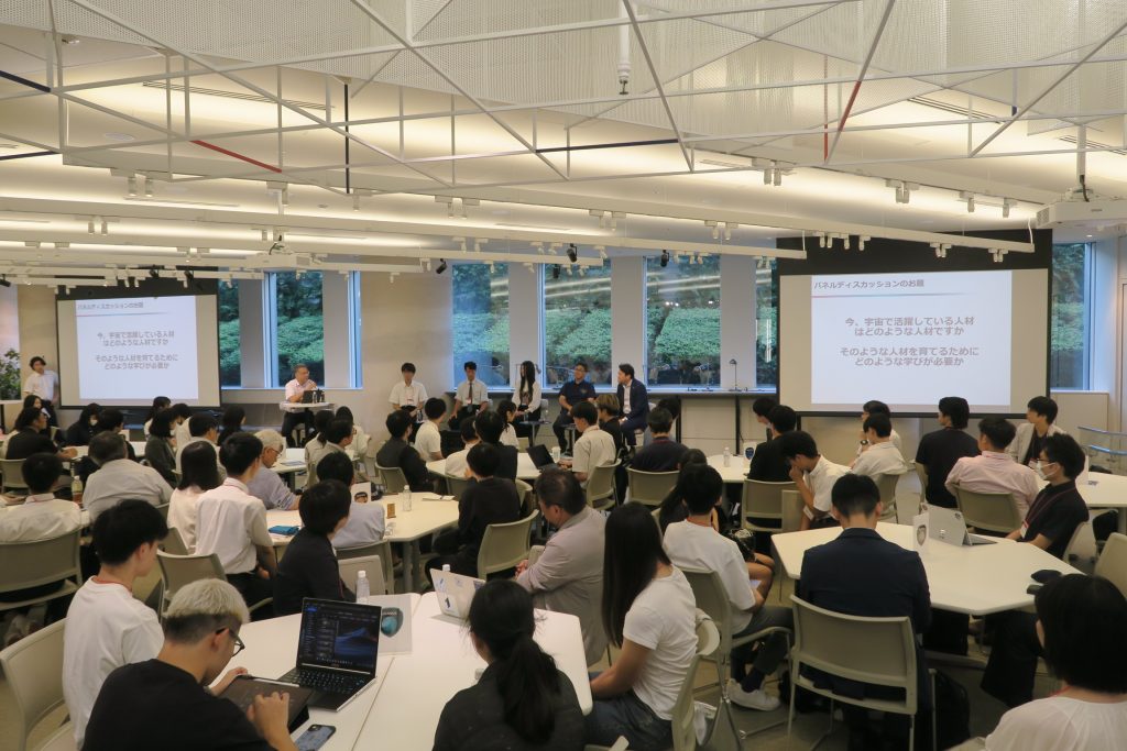 高校生による事例発表に続き、パネルディスカッションでは、SpaceBD CEO 永崎将利氏、航空宇宙工学専攻の大学院生、串本古座高校の先生にもパネリストに加わっていただき、モデレーター中須賀教授による『今、宇宙で活躍している人材はどのような人材ですか』『そのような人材を育てるためにどのような学びが必要か』をテーマに、ディスカッションを行いました。