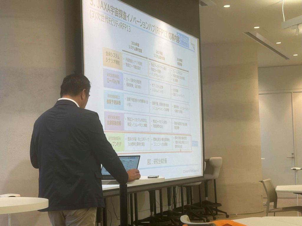 会員企業から、「宇宙ロボット標準検討状況」と、「宇宙関連の取り組み」について発表がありました。